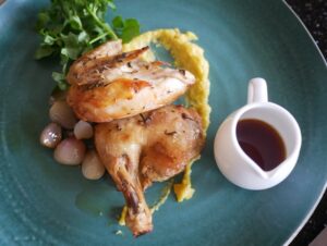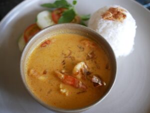 ランチのセットメニューは、前菜、メイン、デザートの三品。こちらはエビのココナッツとスパイス煮込み。