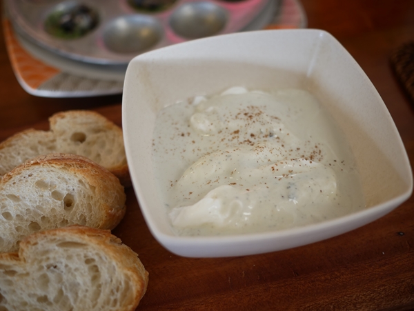 こちらのメニューは日替わり。こちらはブルーチーズとタマゴ。ディップのようにバゲットにつけていただきます。