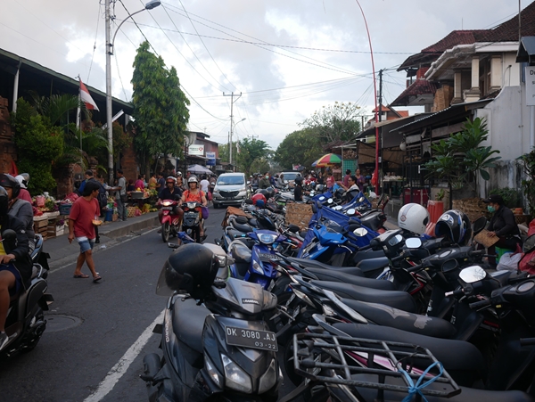 朝の市場はたくさんの人で賑わいます。バイクもこんなにズラッと並んでいます。