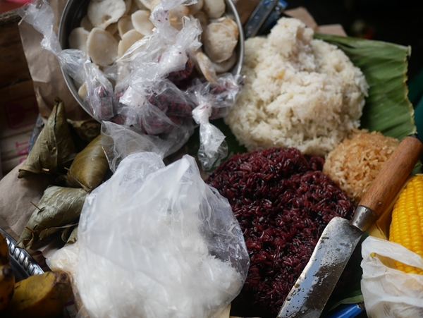 こちらはもち米にココナッツフレークとヤシ砂糖のシロップをかけていただくお菓子。