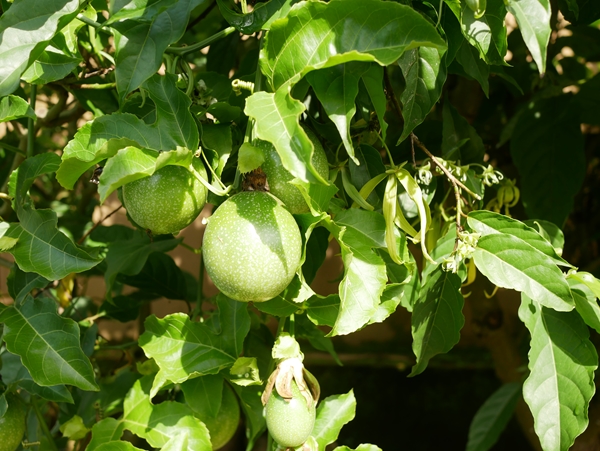 歩いていくと、塀沿いの花壇に青い実が。これはパッションフルーツなんですよ。