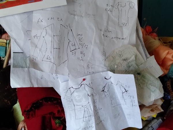 市場で買ったウンドゥッの布と、どんな服を作りたいか、サンプルになる写真や服などを持参すると、