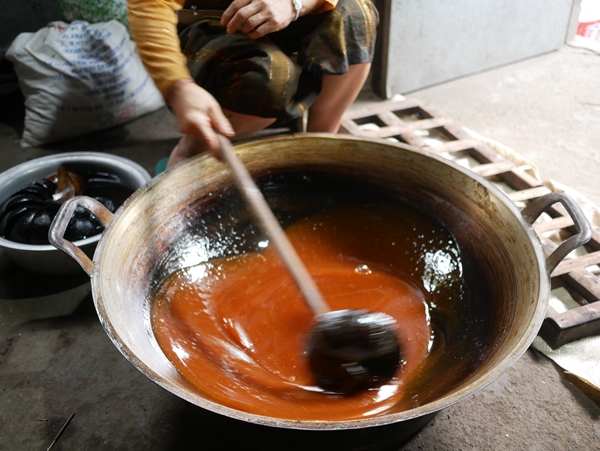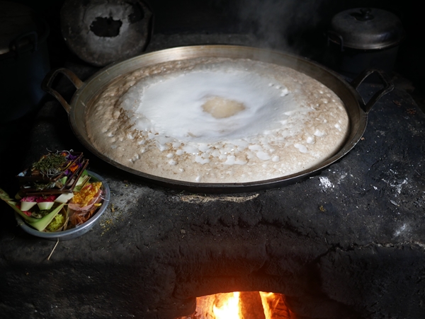 お花の根元を切って出てくる樹液を集めて火にかけます。