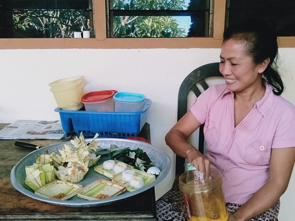 家事や仕事の合間に、女性たちは自宅でお供え物の準備をします。