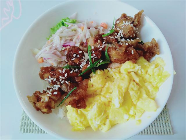 これはチキン唐揚げライスボウル(2万7000ルピア)、少し小さめで女性にちょうどいいくらいでしょうか。
