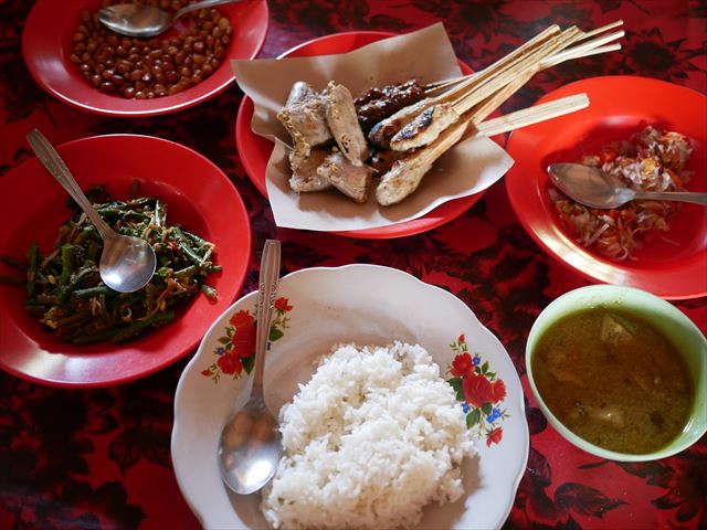 たっぷりのスパイスと魚のサテと、バナナの葉に包んで焼いたペペス。ピリッと辛くて食が進みます。