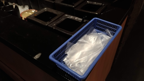 この手袋をしてビュッフェの食材を取れば、他の人との接触がないので安心です。